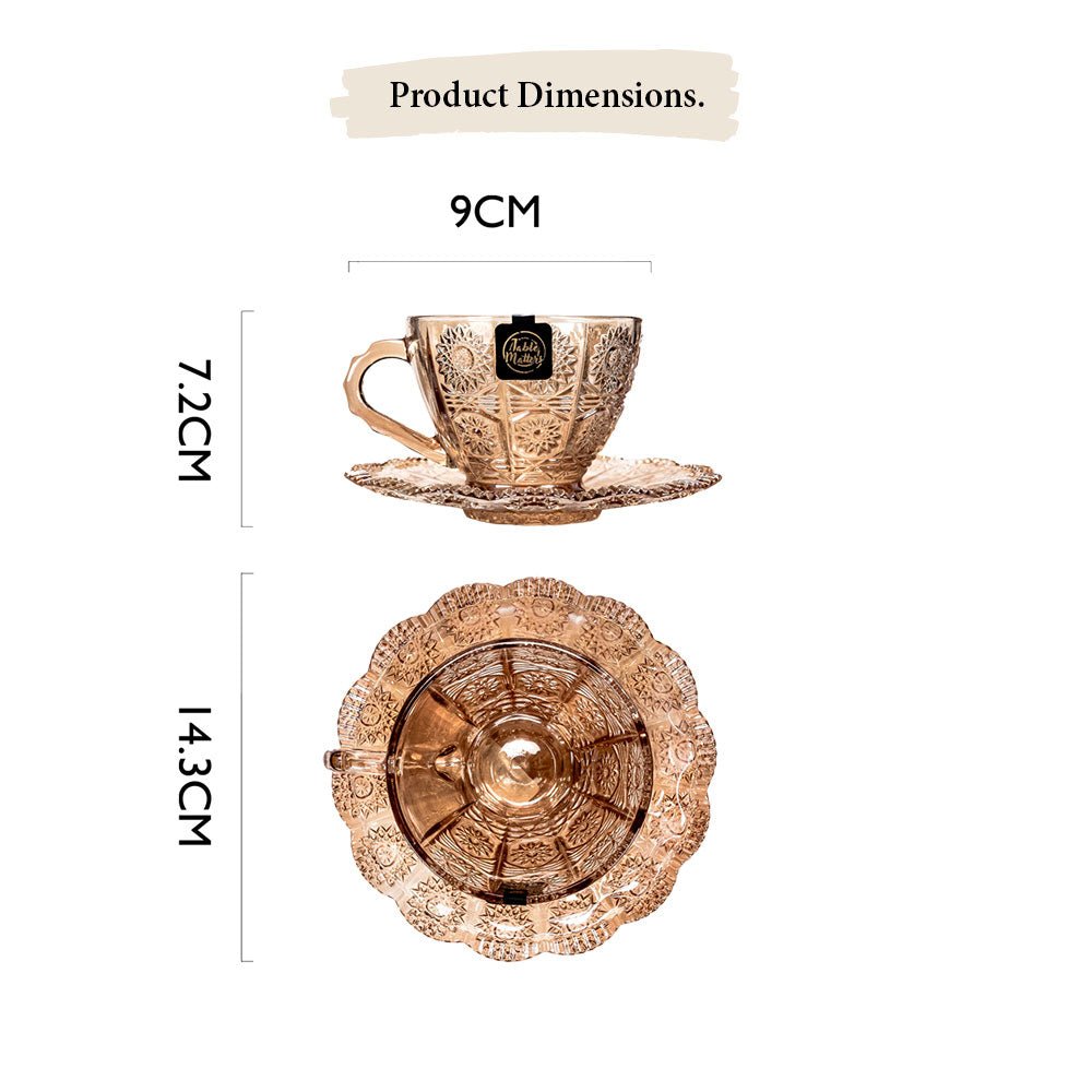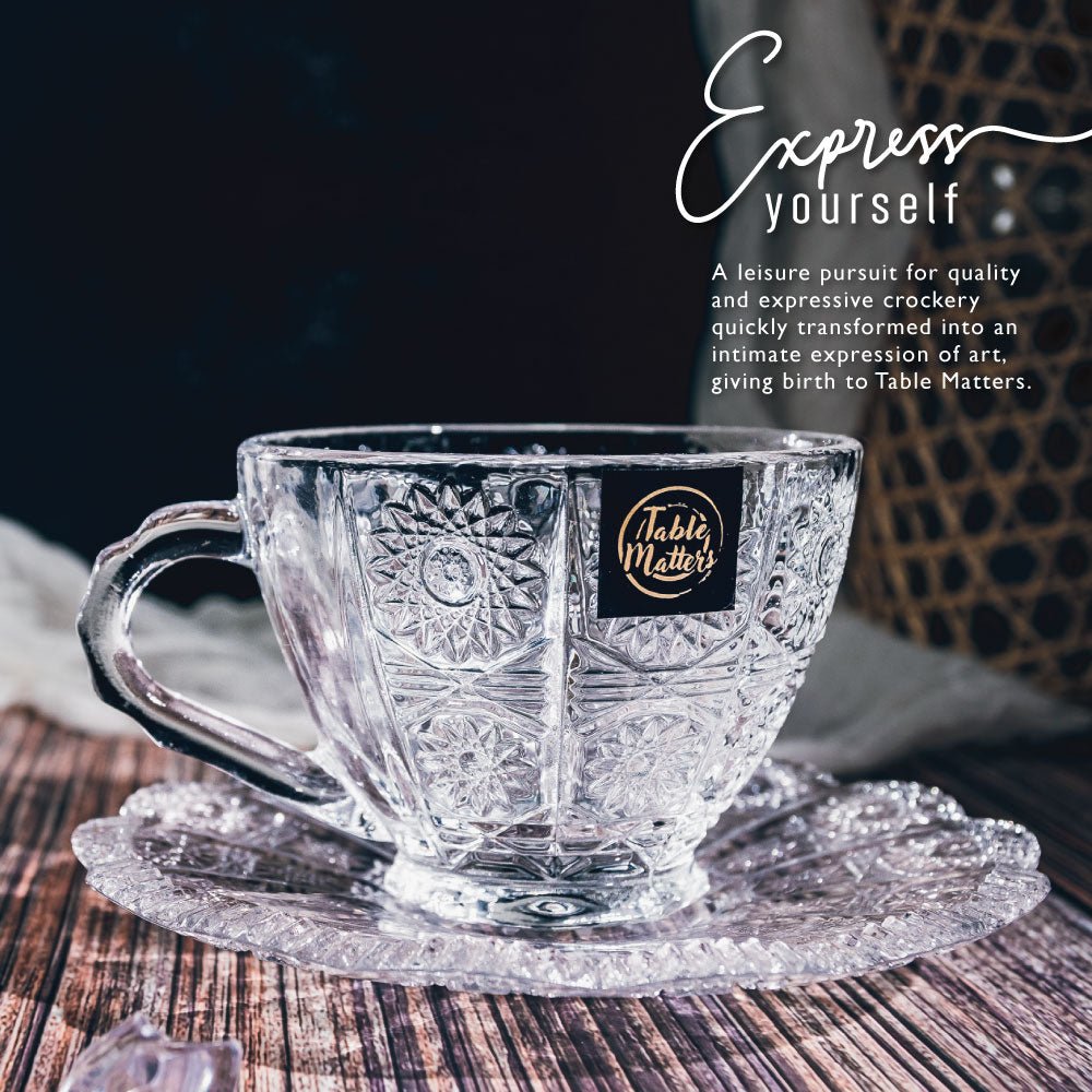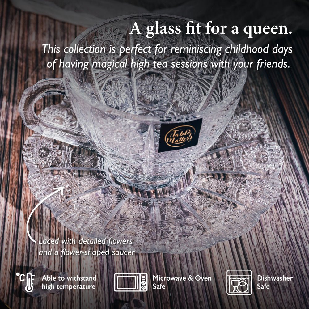 A glass fit for a queen. The TAIKYU lace Glass Cup and Saucer proves that royalty knows no status. Laced with detailed flowers and a flower-shaped saucer. this collection is perfect for reminiscing childhood days of having magical Hi-tea sessions with your friends. Our Taikyu Collection which features a series of durable glassware. Made with high quality and lead-free glass that provides a safer user experience.
