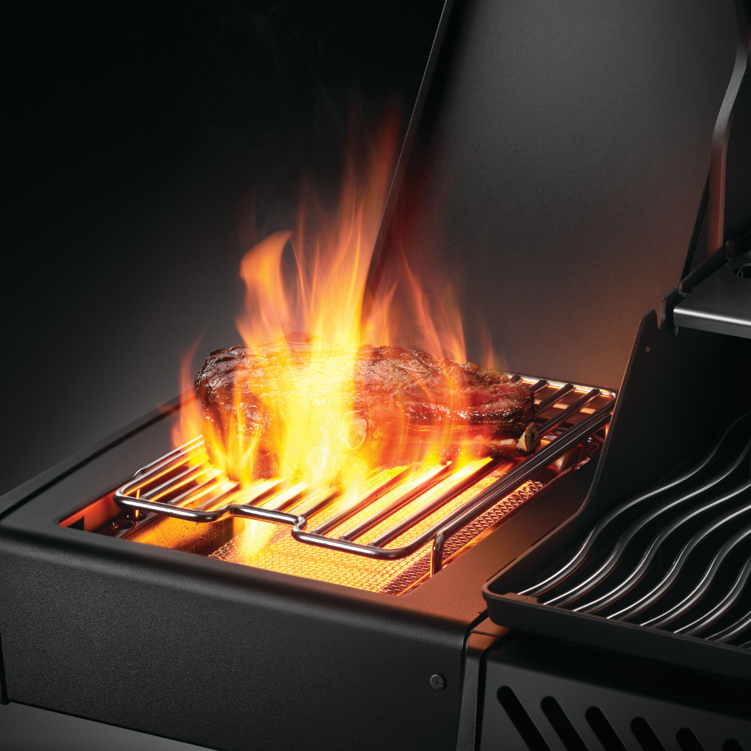 It’s time to break free from boring backyard grilling with the Napoleon Rogue 365/425/525 Propane Gas Grill with side burner in black. Sear succulent seasonal treats on our iconic Wave cast iron cooking grids. Three stainless steel burners produce precise heat where you want it. and dual level stainless steel sear plates vaporise the drippings creating intense flavour while you grill. Make marvellous meals for yourself or a crowd while you cook on 365/425/525 square inches of main grilling area. Succulent sauces and sides are a snap with the integrated range side burner. The easy to maintain black porcelainized lid and single door with integrated storage blend beautifully with your outdoor décor. Locking casters in the pedestal base mean that this grill can be moved into the thick of the action. Folding stainless steel side shelves save space. allowing the Rogue to fit anywhere in your culinary landscape. No other grill gives you such versatility with an affordable price and high quality components.