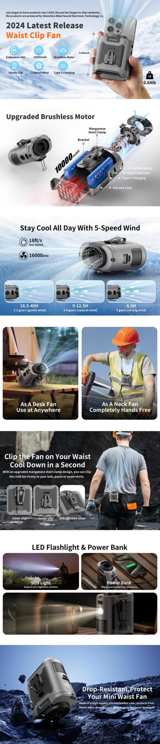 【5 in 1 Multifunctional Waist Clip Fan】An integrated waist clip fan, desk table fan, and neck fan. You can clip this belt fan to your shirts, belt, or pants, or you can hang the personal fan around your neck with the lanyard. With a bracket on the fan clip, you can put this USB fan on the desk. It can be used as an emergency power bank to directly charge a mobile phone, with no more fear of running out of phone battery. Built-in LED Light and SOS function, it not only provides long-term illumination but also helps you with outdoor activities.
